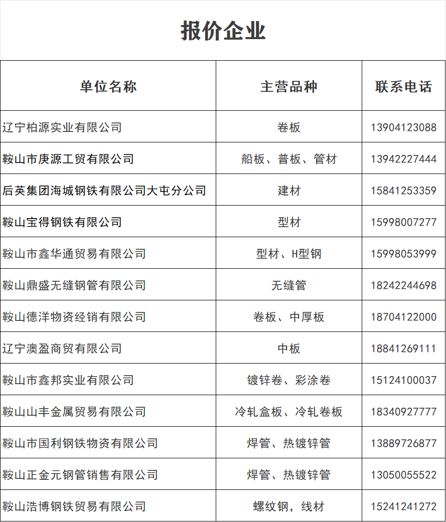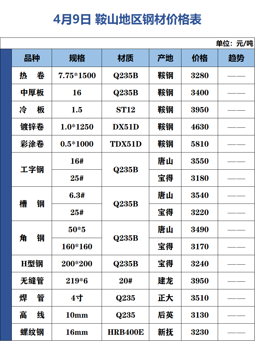 4月9日 鞍山地區(qū)鋼材價(jià)格表