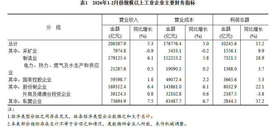 2026年1—2月份全國規(guī)模以上工業(yè)企業(yè)利潤增長15.2%