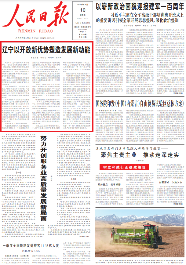 2026年4月10日,人民日?qǐng)?bào)頭版頭條刊發(fā)《遼寧以開放新優(yōu)勢(shì)塑造發(fā)展新動(dòng)能》,全文如下: